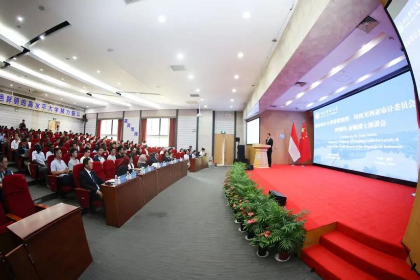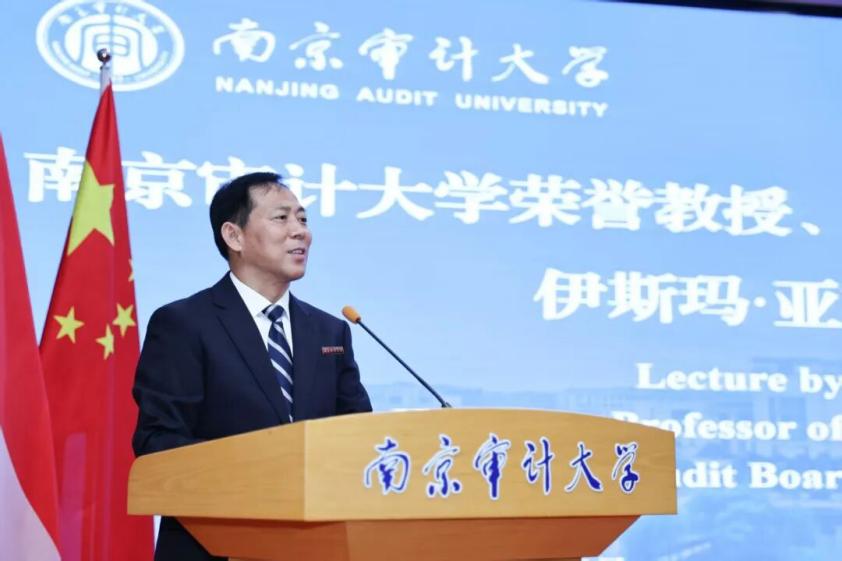 On September 23, Dr. Isma Yatun, Honorary Professor of Nanjing Audit University and Chair of the Audit Board of the Republic of Indonesia, returned to our university to deliver a speech. Ding Yue, Director of the Department of International Cooperation of China's National Audit Office (CNAO), and members of the Audit Board of the Republic of Indonesia attended the event. NAU's Party Secretary Dong Birong presided over the speech.Representatives of our students and teachers listened to the speech.