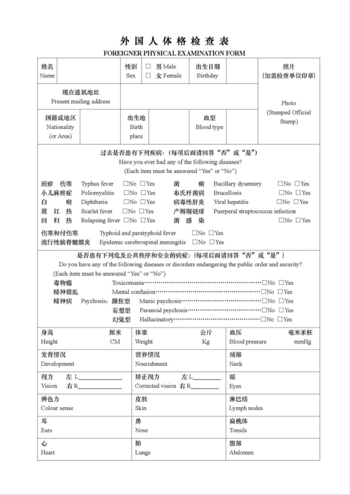 Note: This is a Standard Form for foreign visitors to apply Chinese visa and other related issues, please do not make any change or use other non-standard forms. The result of the examination will expire in six months. The expenses incurred from the physical examinations.