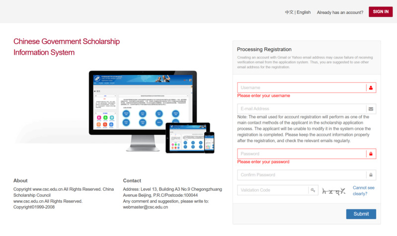 It’s a two-step application process. Firstly, candidates shall visit China Scholarship Council (hereinafter referred as CSC) at http://studyinchina.csc.edu.cn, and make first online application.